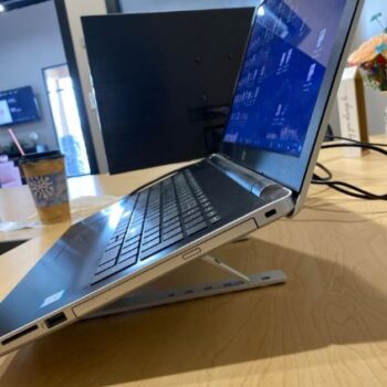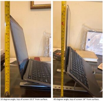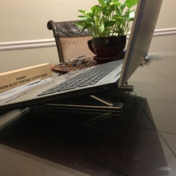 With staying indoors these days (Covid 19)… Zoom has become my new “normal”. Having to put my laptop on top of a box (find the right size) to get the perfect angle has been a hassle I didn’t need. I purchased this Stand… and I can’t be happier! It gives me the perfect angle for viewing and typing. Then it folds up and I can put it in a drawer until I need it next. I am thrilled with this and highly recommend it to anyone. VERY sturdy, has rubber lined on both sides (for your computer AND your table), folds neatly in a little pouch (provided), and holds my laptop perfectly. I tried it with my 15″ PC and it was fine with that size as well. LOVE!!!