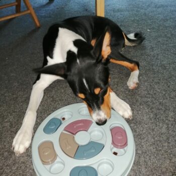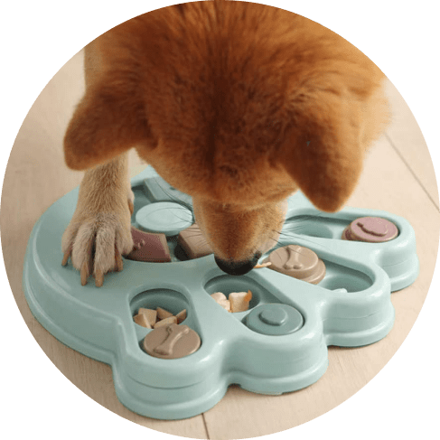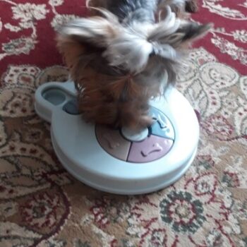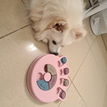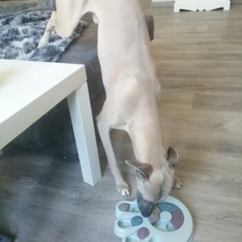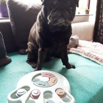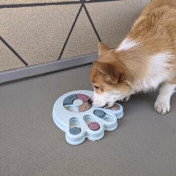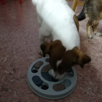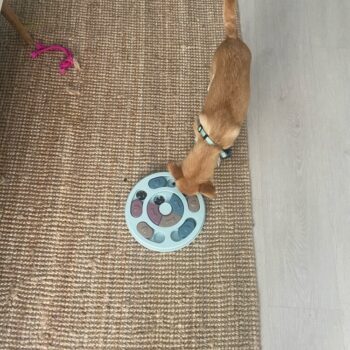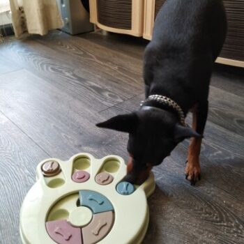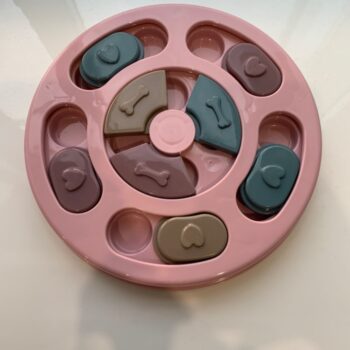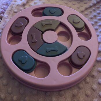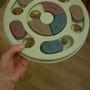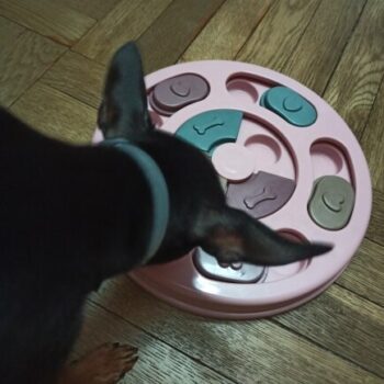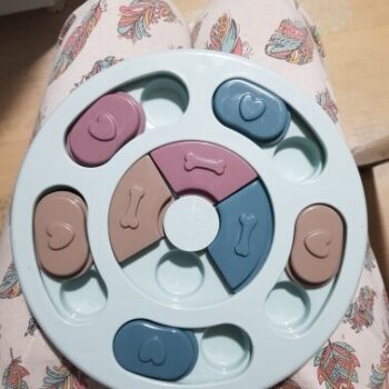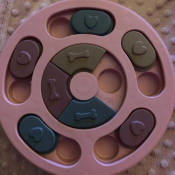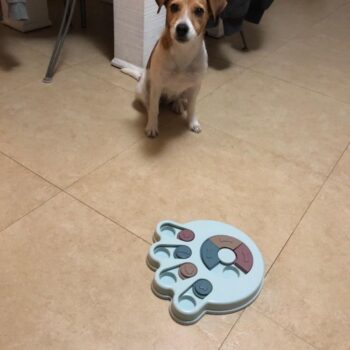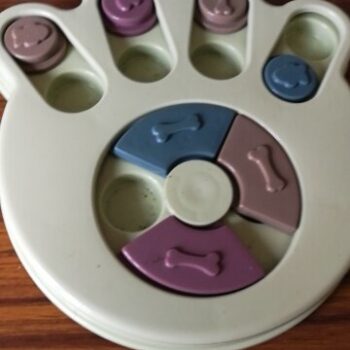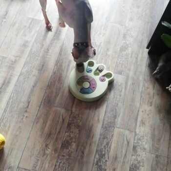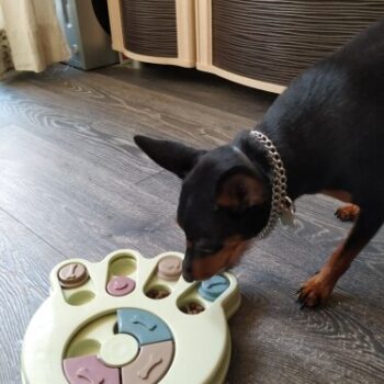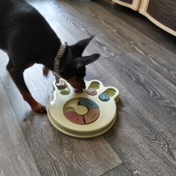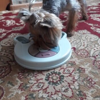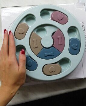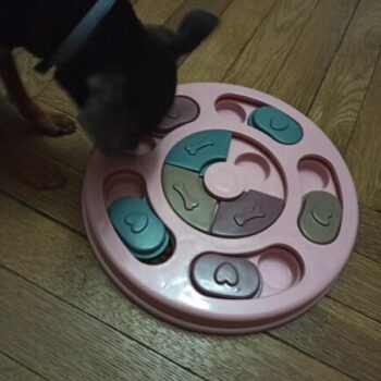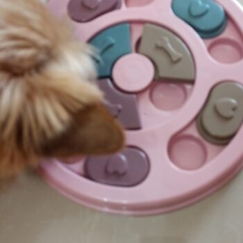 I wasn’t sure if my dog would have anything to do with this. I put treats in it and set it by my dog’s bed. I adopted him after he was rescued from a hoarding situation so he really hasn’t had toys to play with. I’ve had to teach him how to play with them. I noticed the freebie treats were gone one day and checked the rest of the puzzle. All gone! I was amazed. Filled it back up and left it for a few days. Empty again. Now I’ve watched him do it and it’s so funny. I’m going to try to get a video of it. He’s a 15lb chiweenie. Half chihuahua half dachshund and much smarter than I gave him credit. lol