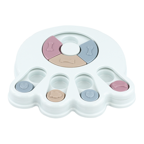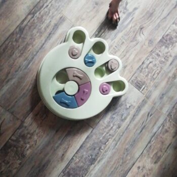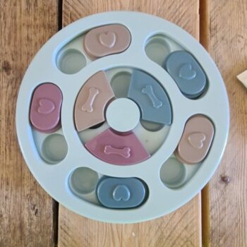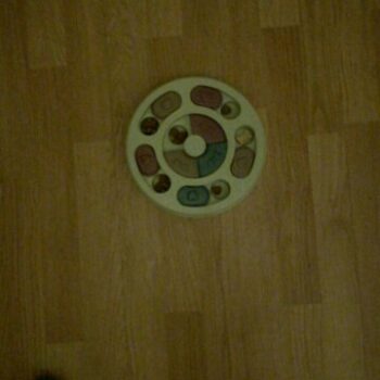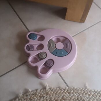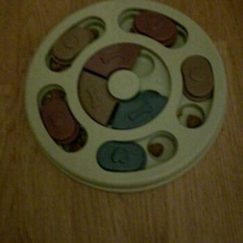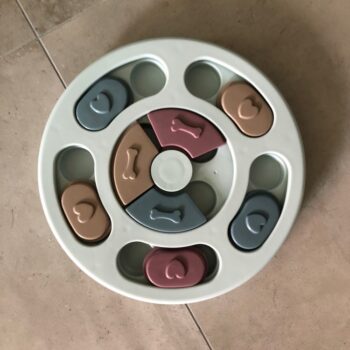My Border Collie, Grace, just loves this "toy." Dogs like Grace need constant mental, physical, and emotional stimulation and this thing helps for a few minutes in the evening. She has learned to check index every one, looking for a treat. When she finds one, she not only gets a treat, but she gets our praise. She has learned to use both her nose and her paw to manipulate the rounds. It is well built and heavy enough that it stays in place when Grace is playing with it. Because she still chews everything, after a few games, we take it up off the floor. Wonderful toy and I'm highly recommending.