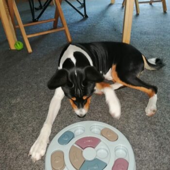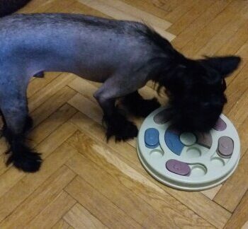 I love my dog more than life itself. He’s a rescue so not sure of his age. We think 15 (going on 3). Bought this puzzle hoping he would have fun and use it. Had no clue how fast he took to it. He’s not the most ‘intelligent’ so I wondered but he got the treats so fast. He hasn’t used his paws yet to move the pieces around, just uses his nose, but he’s doing it. Everytime he gets one I cheer for him and his tail wags like crazy and he continues on. He love his puzzle. I can’t wait to get him more so that he will get that brain going when I’m at work during the day (even though he’d probably play with it before I am even out of the driveway)