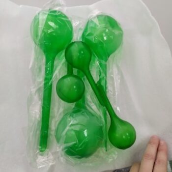 These are sturdy green plastic watering bulbs, easy to fill right at your kitchen tap and sure are a great time saver. My plants are thankful that I ordered them since they are getting better attention now! I only have to go around once a week to check these bulbs and refill if needed.