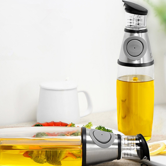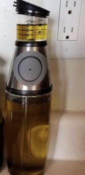 The button on our Scaled Oil Dispenser suctions oil via a vacuum tube from the main chamber of the bottle into the scaled chamber atop near the spout. Just press and hold. When the button is released, no more oil is dispensed into the top chamber. From the top chamber, you can then see the measurement levels of oil and tilt the bottle to dispense accordingly.