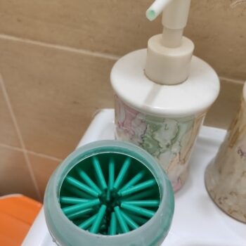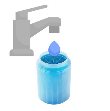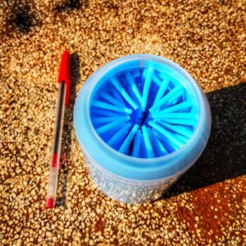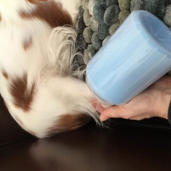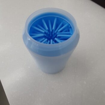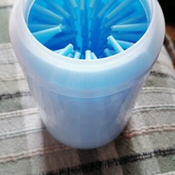 My chihuahua reluctantly agreed to let my grandson clean his paws with this paw cleaner. It consists of a sturdy plastic cup with soft, silicone fingerlets inside for cleaning. Just fill the cup about 3/4 full with warm soapy water and put the dog’s paw in a few times. The paw comes clean in a jiffy. Repeat on the other 3 paws. It can be used on a little or a big dog. It’s portable so it’s good to take camping, to the park, or to use at home.