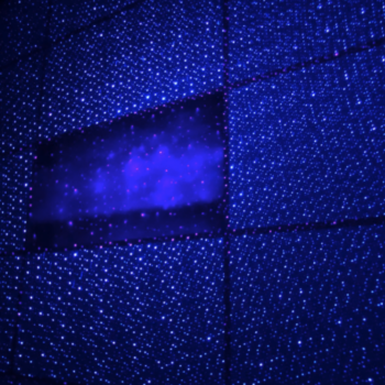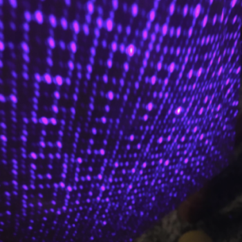 Throws up quite a bit of nice effects wherever it is pointed. The further away from the target the wider the spread of stars and such. Our granddaughter loved the stars on the ceiling effect. It runs quite a long time on a USB battery, so it's extremely portable! I used it during a BBQ party and lit up our outside area. Very cool and well made.